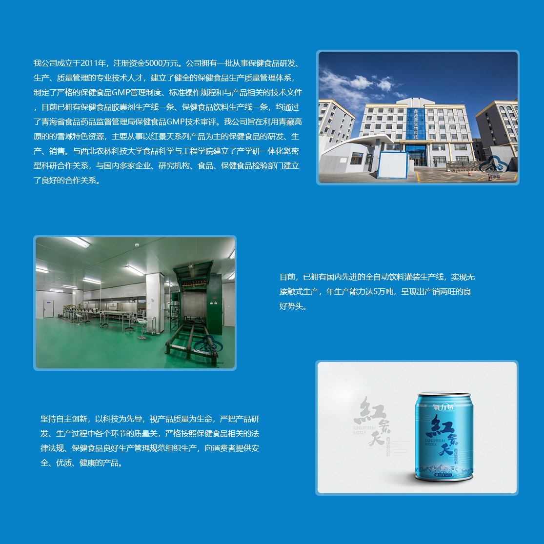 鑫池源公司立足于青海省綠色環(huán)保無污染的高品質(zhì)紅景天資源,以西北農(nóng)林科技大學(xué)食品科學(xué)與工程學(xué)院和青海格拉丹東藥業(yè)有限公司為技術(shù)依托,主要從事紅景天、紅枸杞、黑枸杞等高原生態(tài)植物資源的研究開發(fā)和深加工,產(chǎn)品包括“景胨”牌紅景天西洋參保健飲品、紅景天口服液、紅景天膠囊等系列產(chǎn)品。